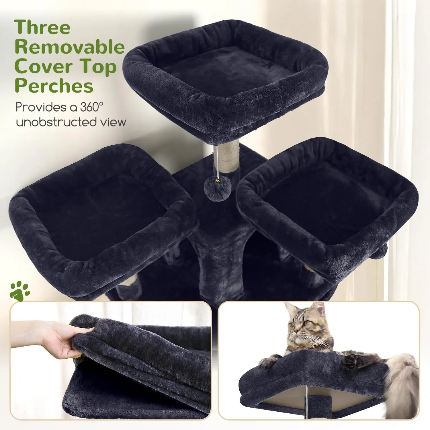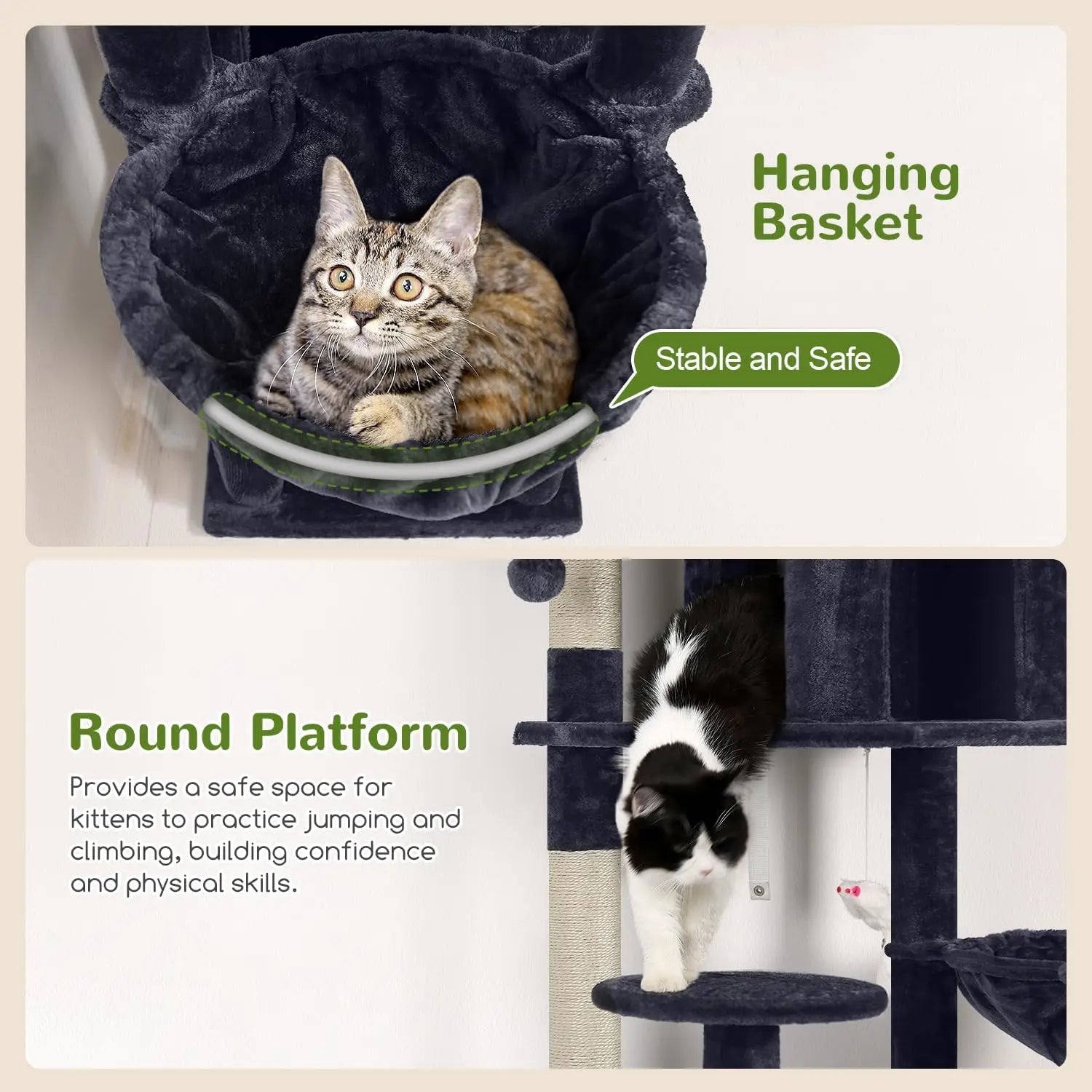 - Three elevated perches plus tiered platforms and two hanging baskets give you varied sunbathing spots, play zones, and escape routes for your cats.